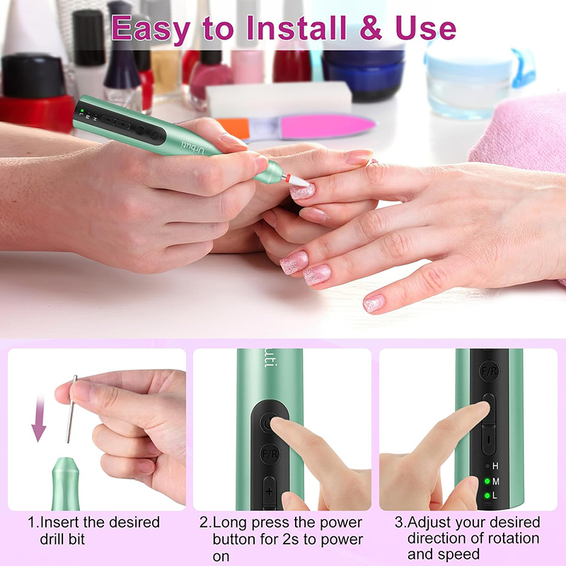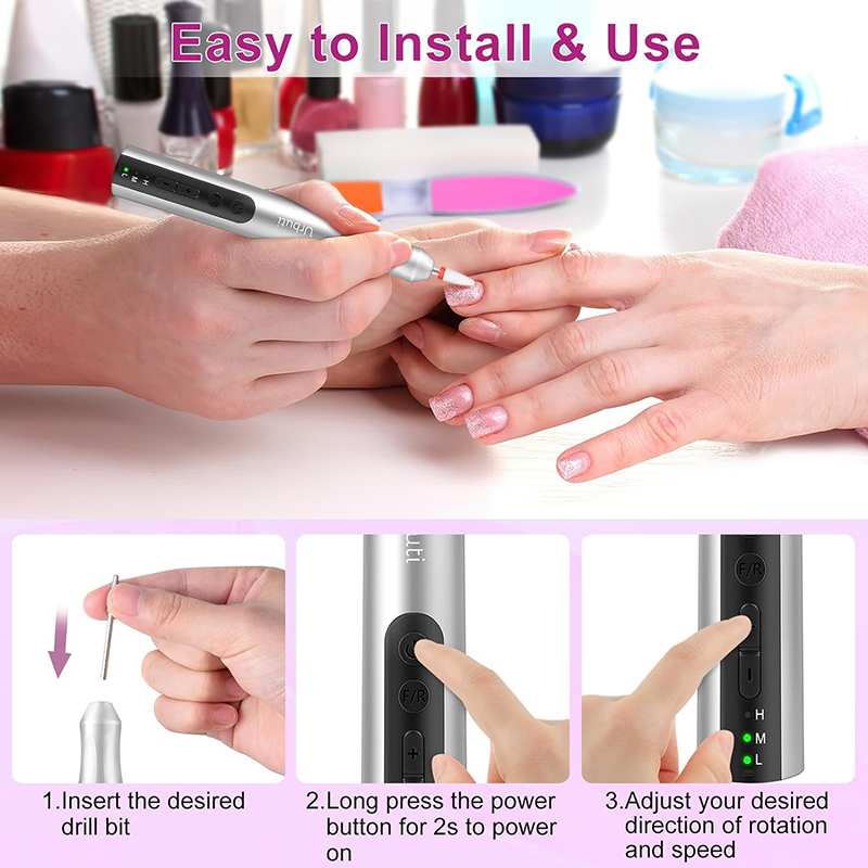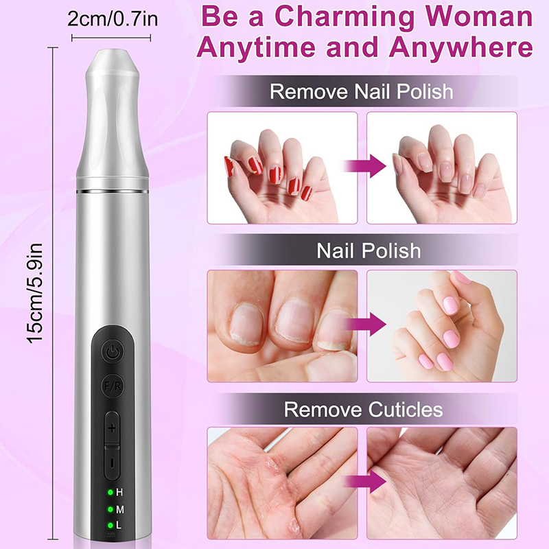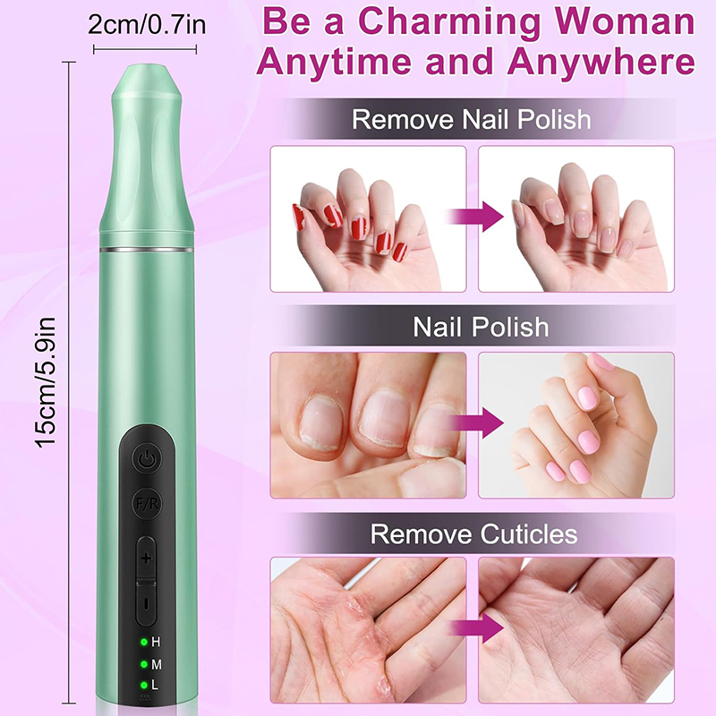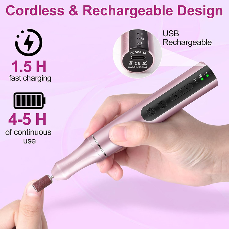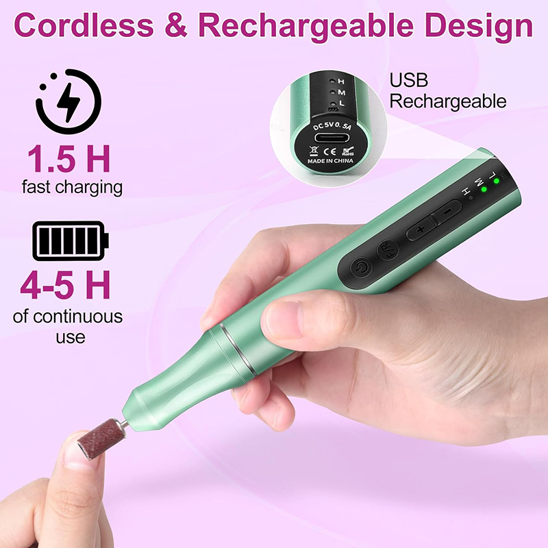 この電動ネイルドリルは、最新のアルミボディと防振設計を採用しており、爪を研ぐ際の騒音と熱を効果的に低減し、爪を磨くときに誰にも迷惑をかけません。人間工学に基づいたペン型の外観により、滑りにくく快適なグリップが得られ、ジェルネイルを簡単に取り除くことができます。