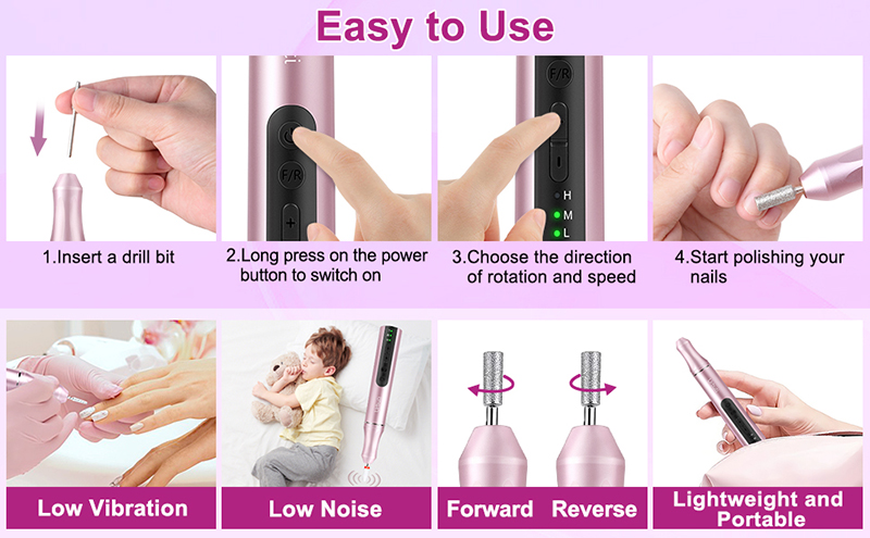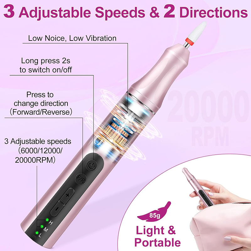 プロフェッショナルネイルファイルは、6000-12000-20000の3段階の速度で設計されており、+または-ボタンを短く押すだけで速度を上げたり下げたりできます。速度を簡単に調整でき、爪を研ぐ時間を節約できます。ドリルの方向は、F / Rボタンを押すだけで簡単に変更できます。左利きの人、ネイルアーティストの達人、またはネイルケアの初心者に最適です。