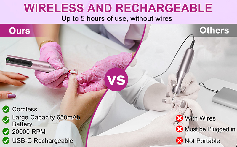 アクリルネイル用のネイルドリルは軽量設計(85g)で、ハンドバッグや洋服のポケットに収まります。USB充電ケーブルも付属しており、USBデバイスに簡単に差し込んで充電できるので、いつでもどこでもネイルケアを楽しめます。