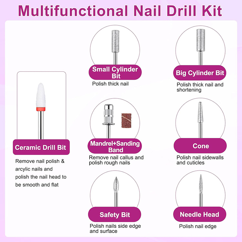 コードレスネイルドリルセットには、さまざまな研磨ベルトとさまざまなドリルビットが用意されており、さまざまなタイプの爪に適したものを選択できます。ドリルを交換するには、ドリルを引き出して、目的のドリルと交換し、オン/オフボタンを押して使用するだけです。女性の友人への理想的な贈り物になります。この製品についてご質問がある場合は、お気軽にお問い合わせください。