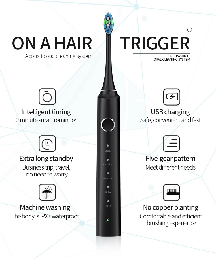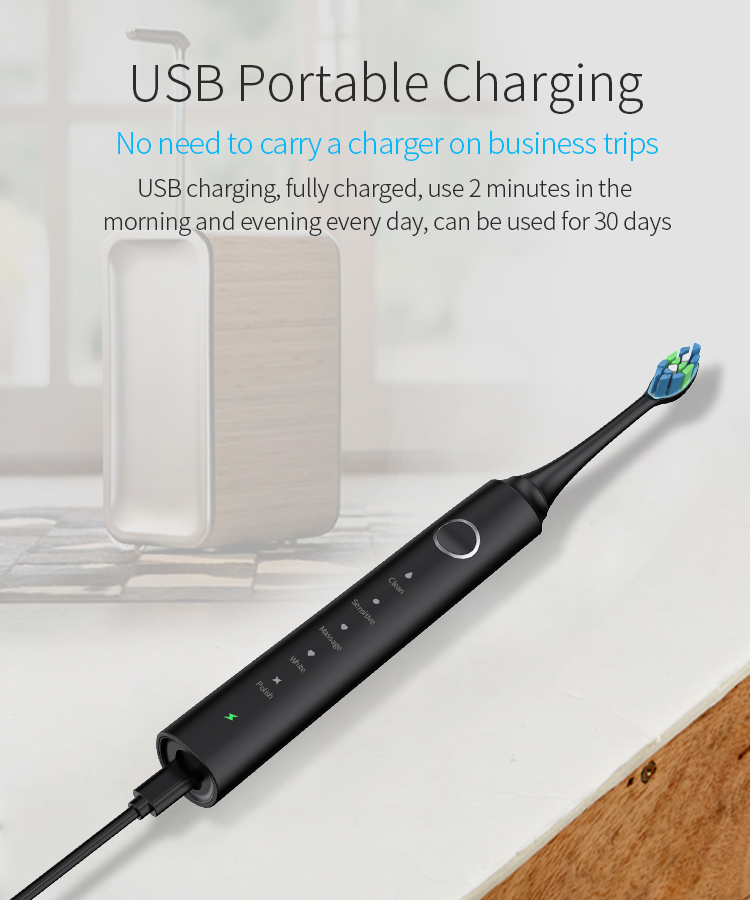 - 5 つの高性能ブラッシング モード - クリーン (弱)、ホワイト (強)、ポリッシュ (強反転周波数)、マイルド (弱反転周波数)、センシティブ (ソフト) の歯と歯茎のさまざまな状態に合わせて、好みや歯科医の推奨に応じてさまざまなモードを選択できます。