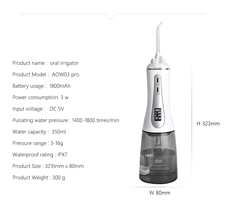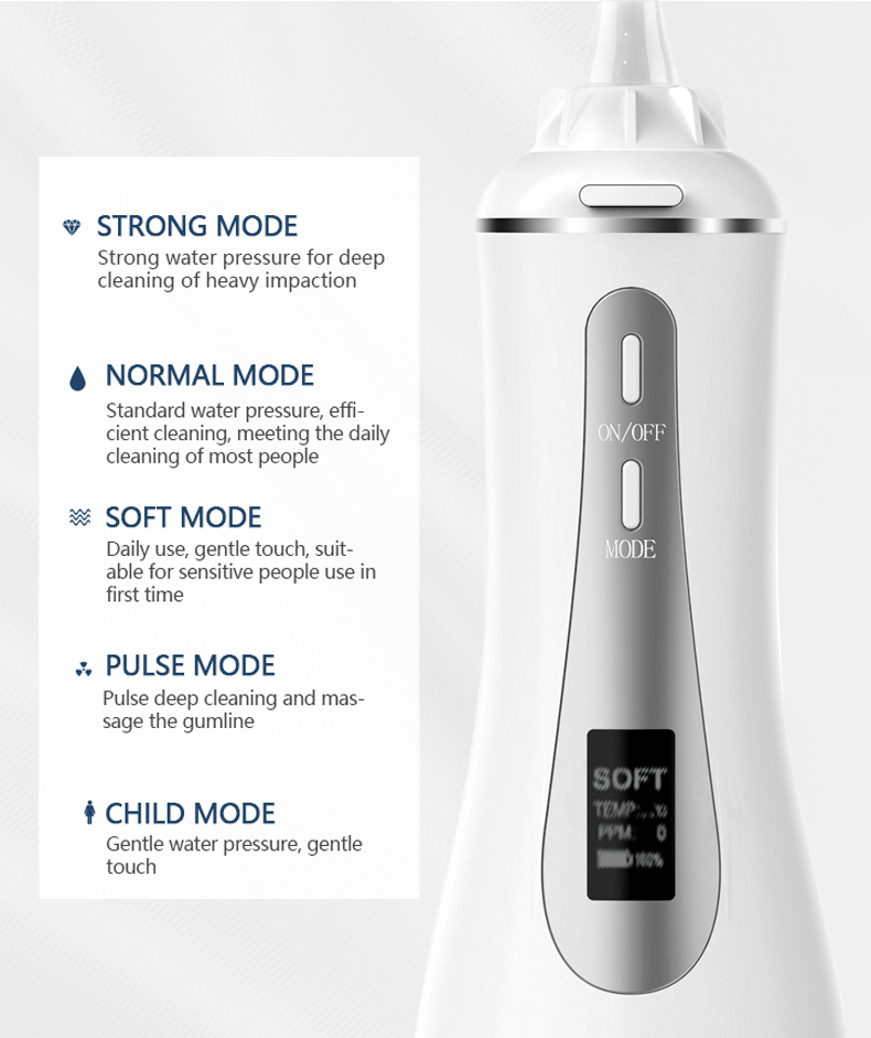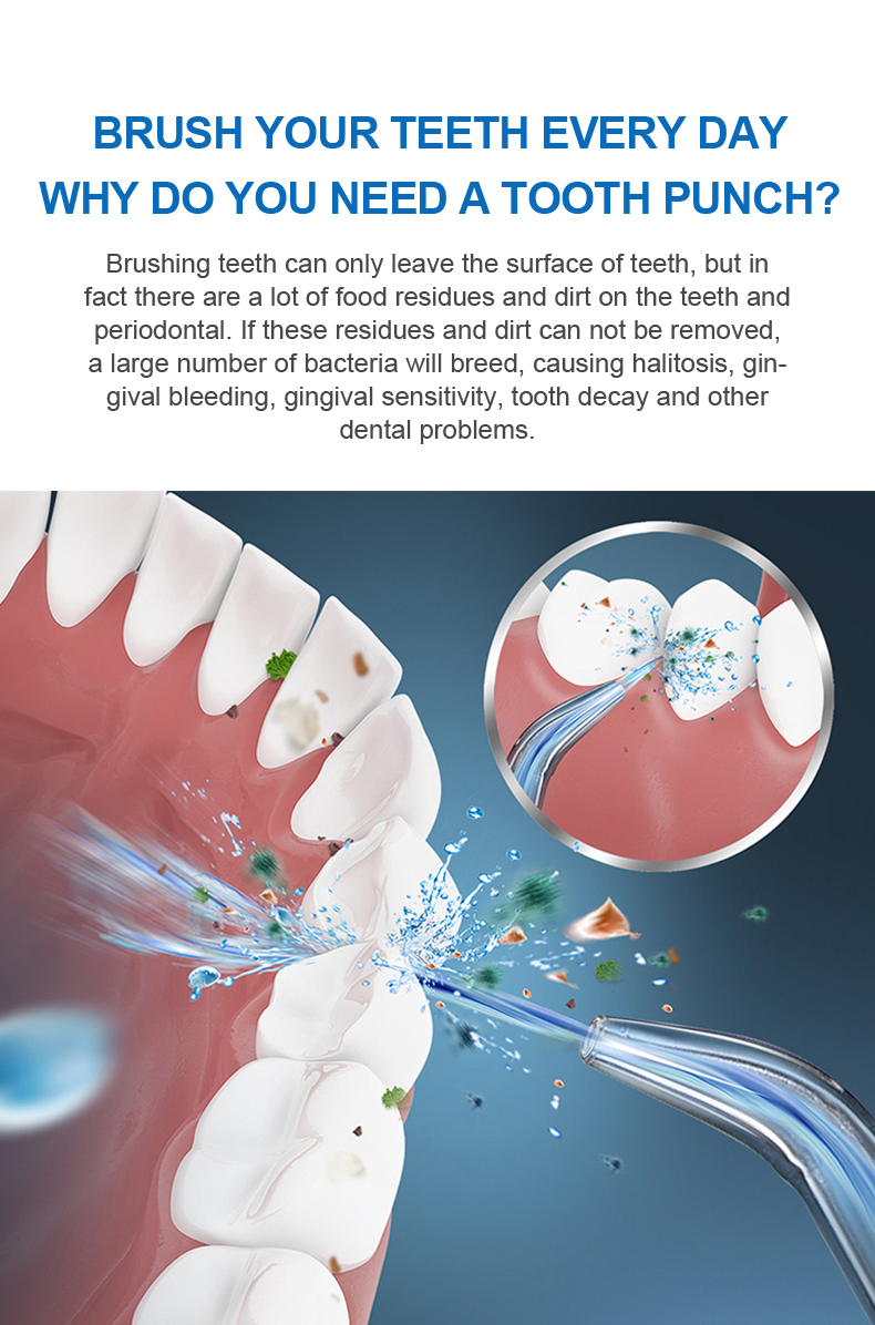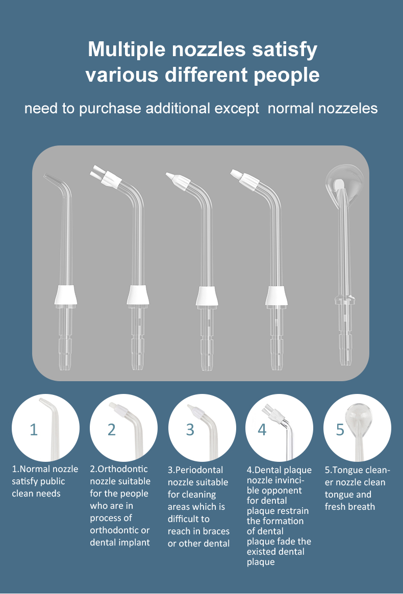 このウォーターデンタルピックは、1分間に1400~1800回の高水圧パルスを発し、歯垢の99.9%を効果的に除去して歯の奥深くまで洗浄します。このウォーターデンタルピックは歯茎をマッサージし、血行を促進し、口臭や歯列矯正などの口腔の問題に対処します。