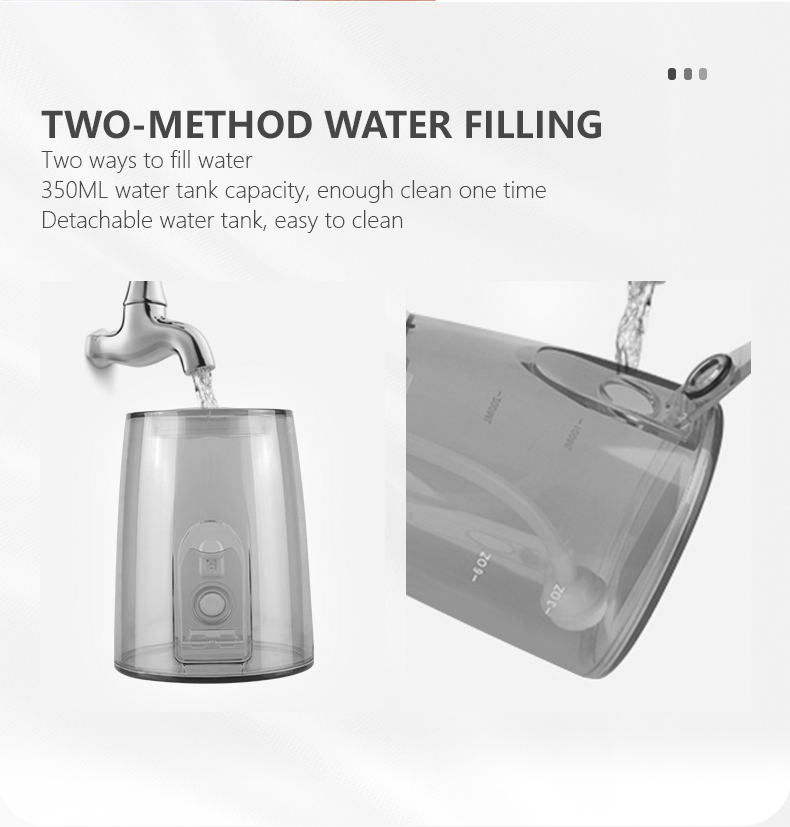 このウォーターデンタルフロッサーは、アップグレードされた350mlの水タンクを備えており、他の旧モデルの2倍の容量があり、頻繁な補充が不要になり、口腔洗浄がより便利で効率的になります。