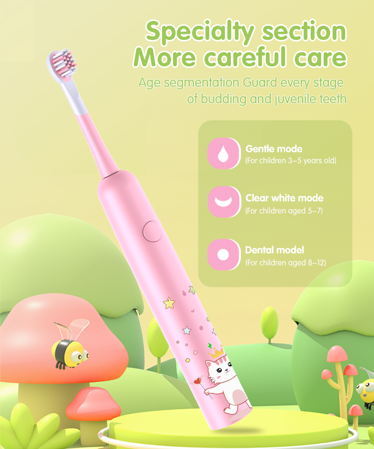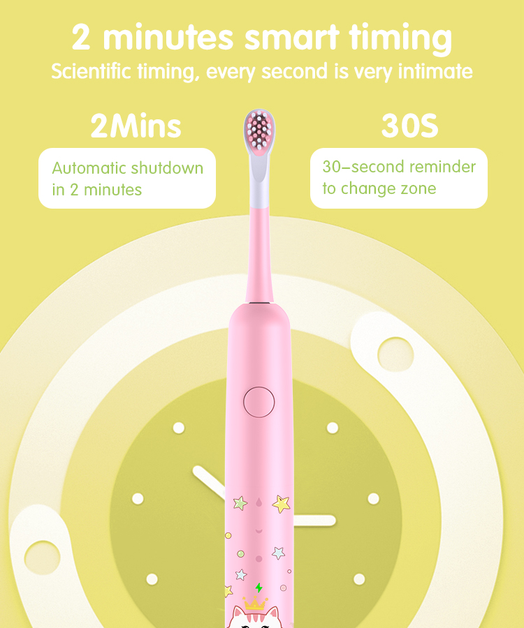 - 自動タイマー: この電動歯ブラシには 2 分間のスマート タイマーが内蔵されており、お子様が長時間歯を磨くように促し、良い歯磨き習慣を身につけ、虫歯を減らします。