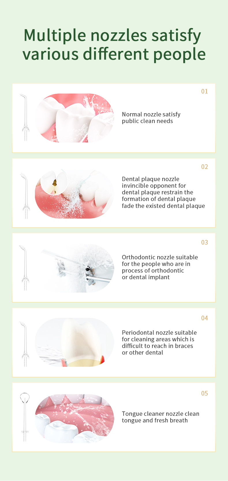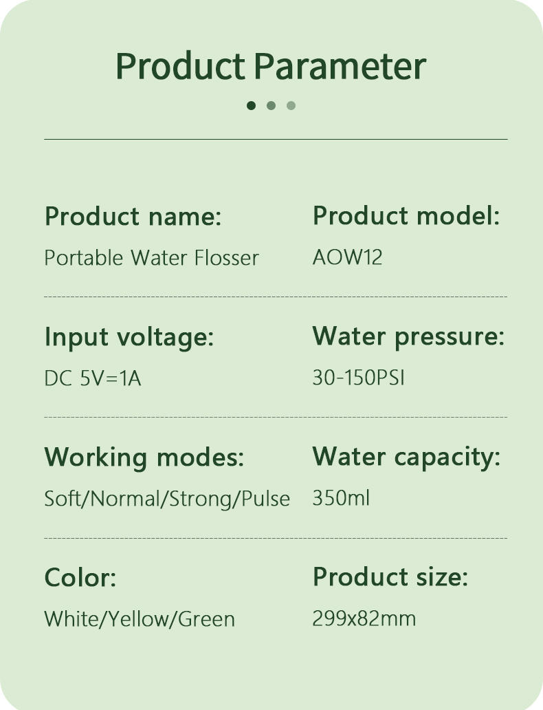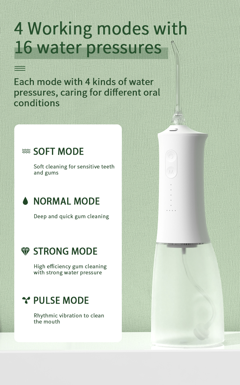 このウォーターデンタルピックは、1分間に1400~1800回の高水圧パルスを発し、歯垢の99.9%を効果的に除去して歯の奥深くまで洗浄します。このウォーターデンタルピックは歯茎をマッサージし、血行を促進し、口臭や歯列矯正などの口腔の問題に対処します。
