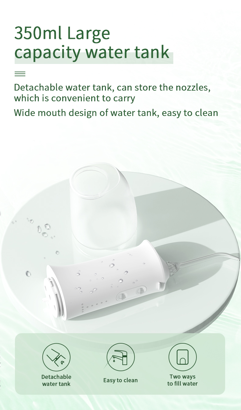 このウォーターデンタルフロッサーは、アップグレードされた350mlの水タンクを備えており、他の旧モデルの2倍の容量があり、頻繁な補充が不要になり、口腔洗浄がより便利で効率的になります。
