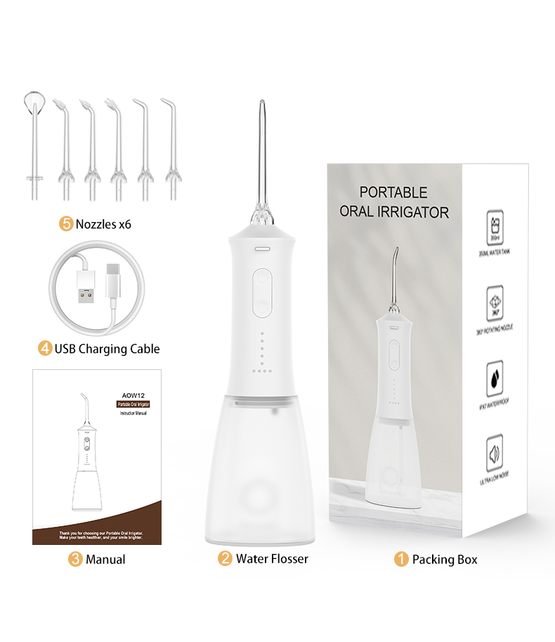 パッケージ: ウォーターフロッサー本体 1 個、チップ 5 個、USB ケーブル 1 本、ユーザーマニュアル 1 部、ギフトボックス 1 個。